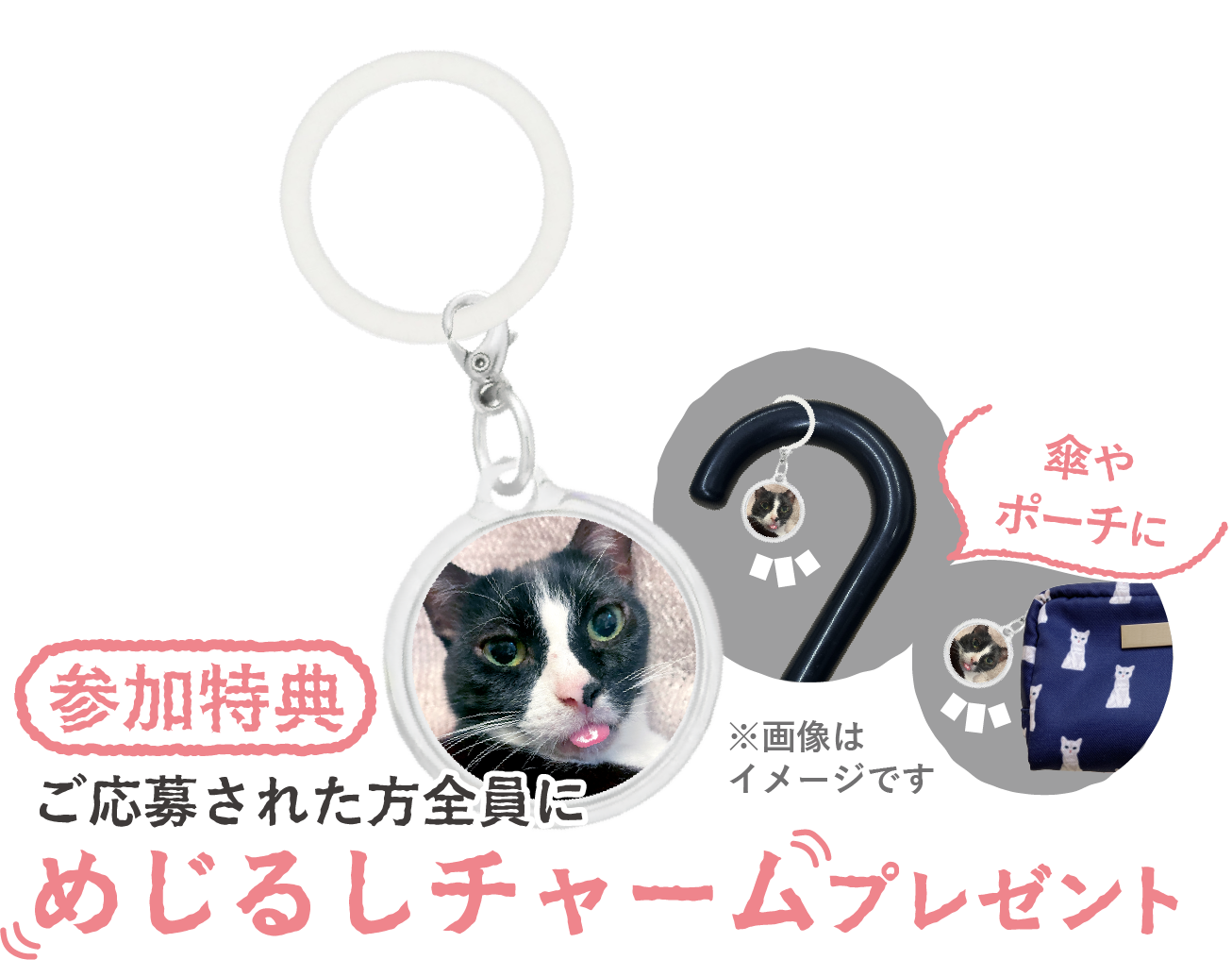 ご応募されたお写真で「めじるしチャーム」を1個作製の上進呈いたします。「めじるしチャーム」は弊社指定のもので、お写真の配置やトリミング、レイアウトは弊社にて行わせていただきます。こちらに関してのご要望等はお受けいたしかねます。