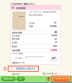 それぞれの設定内容、合計金額に誤りがないかご確認した後、「利用規約に同意する」(①)にチェックを入れた上で画面右下の「この内容で注文する」(②)ボタンを押してください。